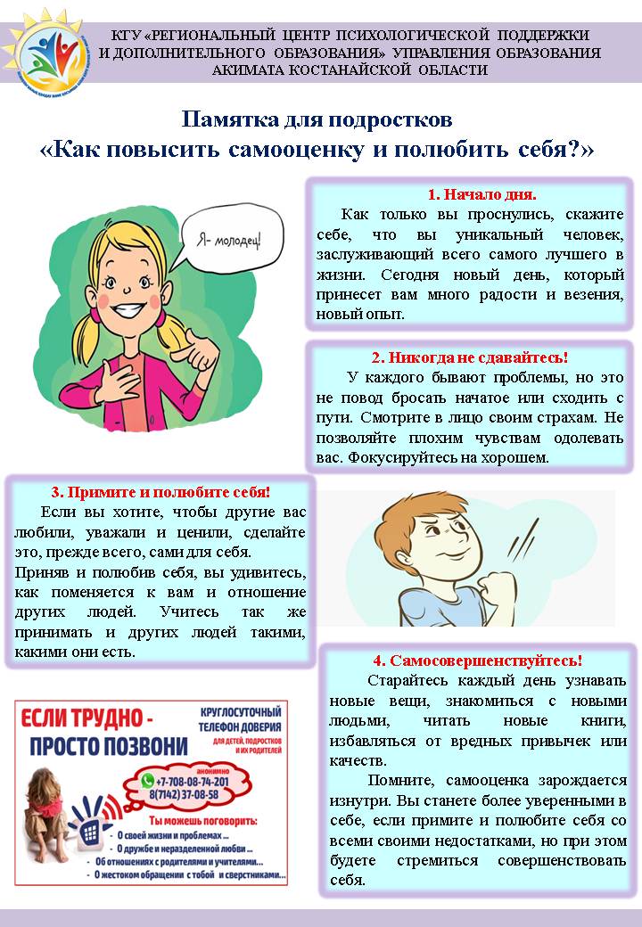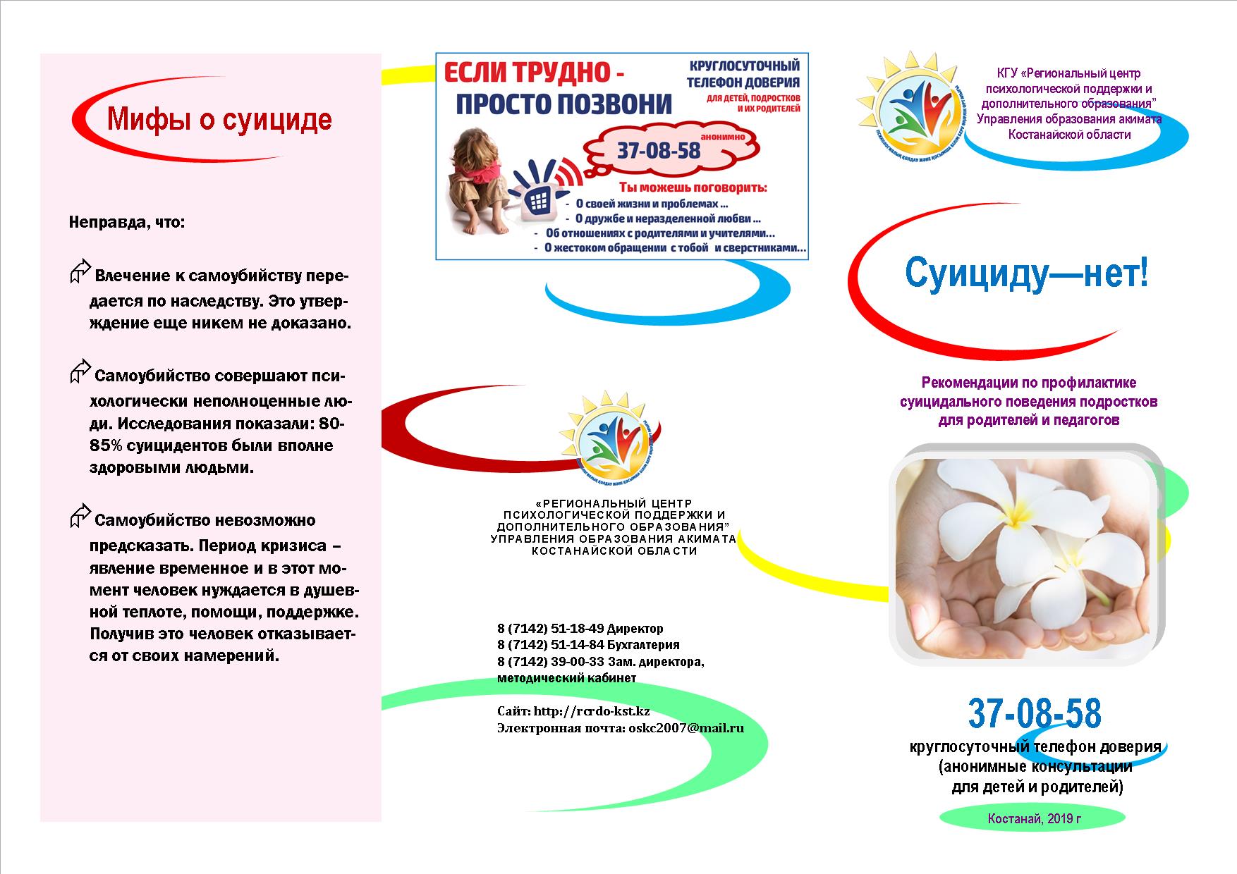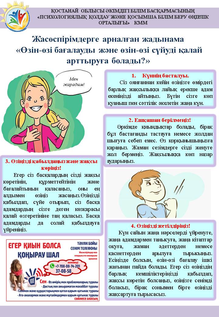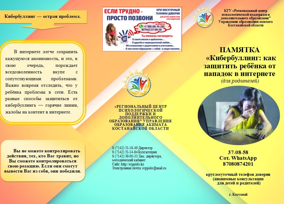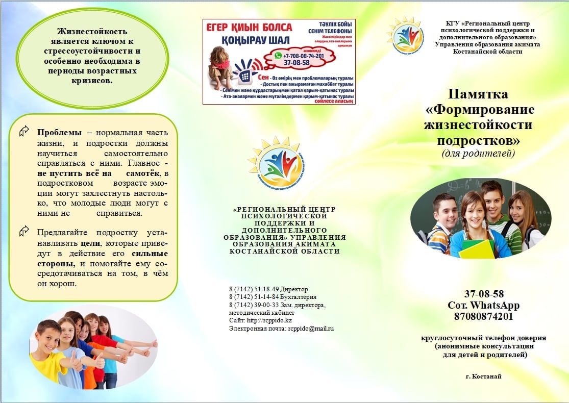 37-08-58, 8-708-087-42-01 – телефон доверия, действующий на бесплатной и анонимной основе при фронт-офисе КГУ «Региональный центр психологической поддержки и дополнительного образования» управления образования акимата Костанайской области.
