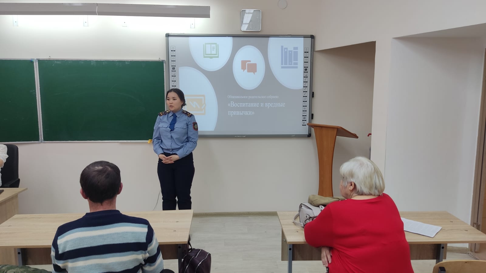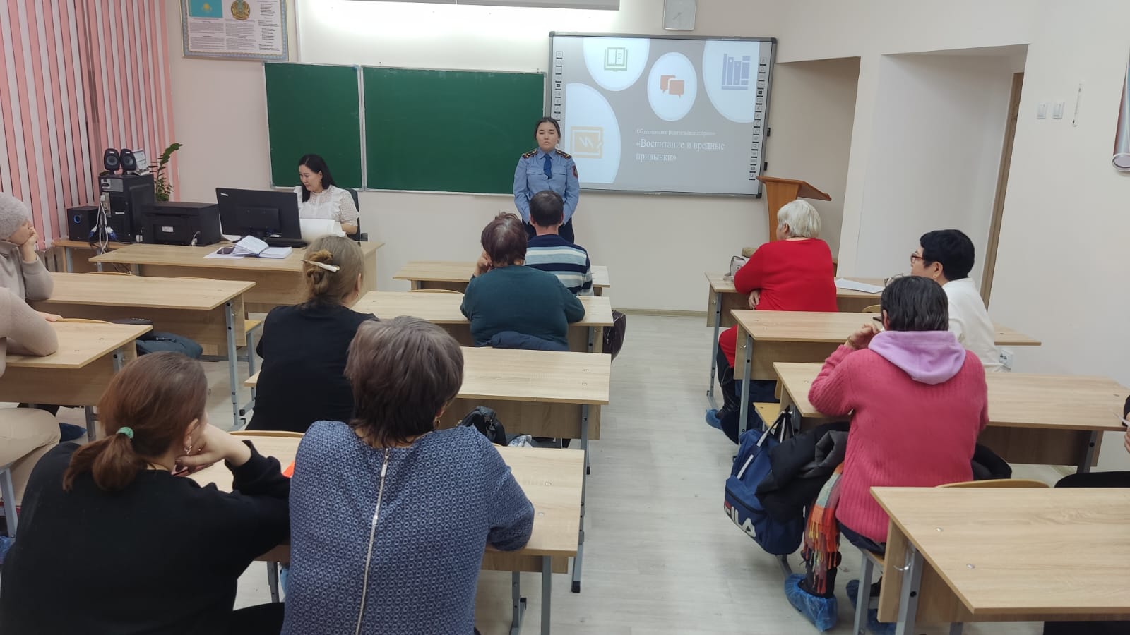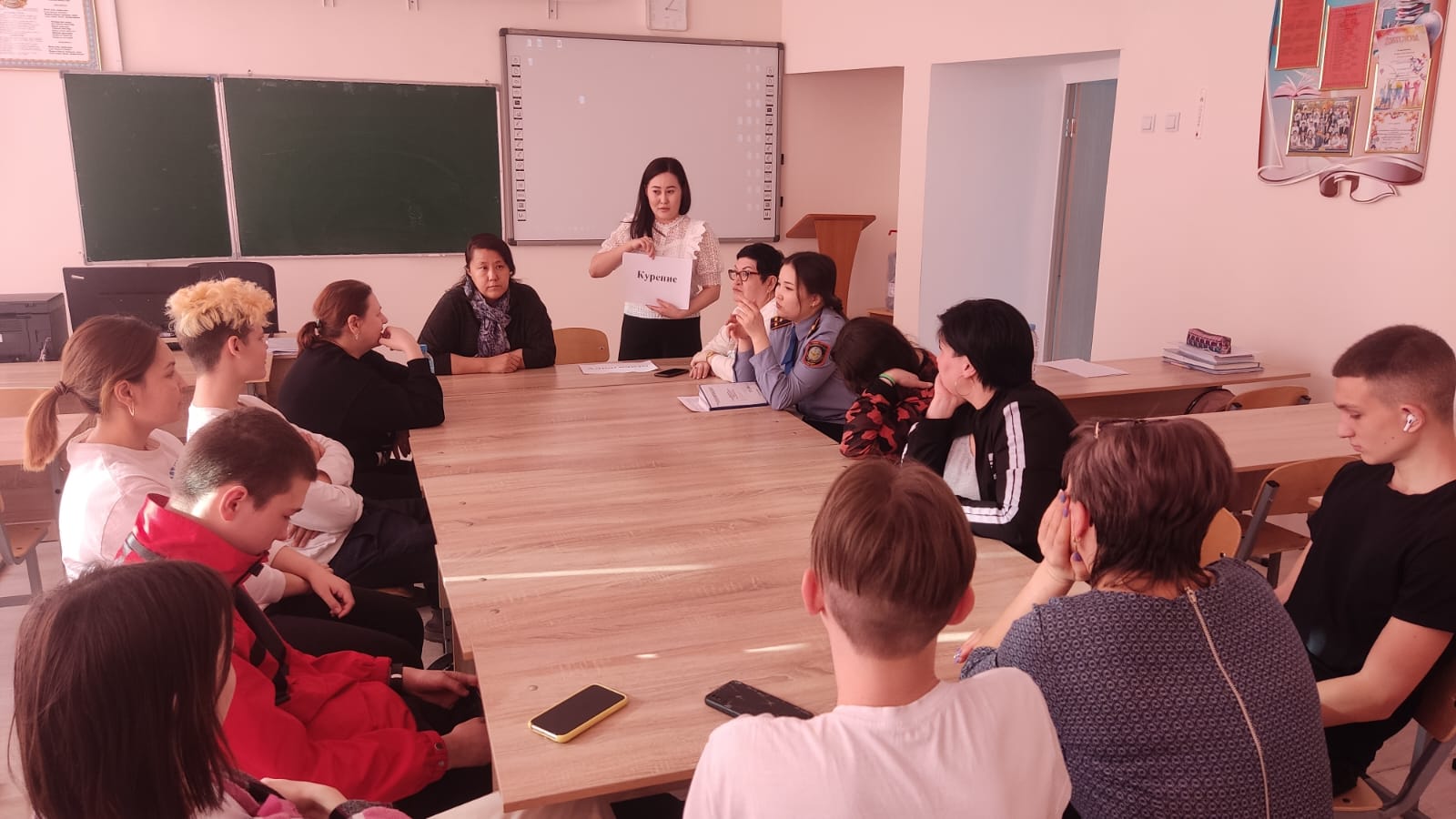 С актуальными проблемами современного общества: курением, употреблением алкогольных напитков, ПАВ, использованием бранных слов среди подростков, об искоренении вредных привычек, исходящих от семьи, ознакомила социальный педагог школы Мурзагалиева А. А. Инспектор ГЮП Шарипова Ж. М. рассказала о последствиях употребления алкоголя, ПАВ, ненормативной лексики, а также об административной, уголовной ответственности несовершеннолетних и их законных представителей за употребление и продажу наркотических средств.