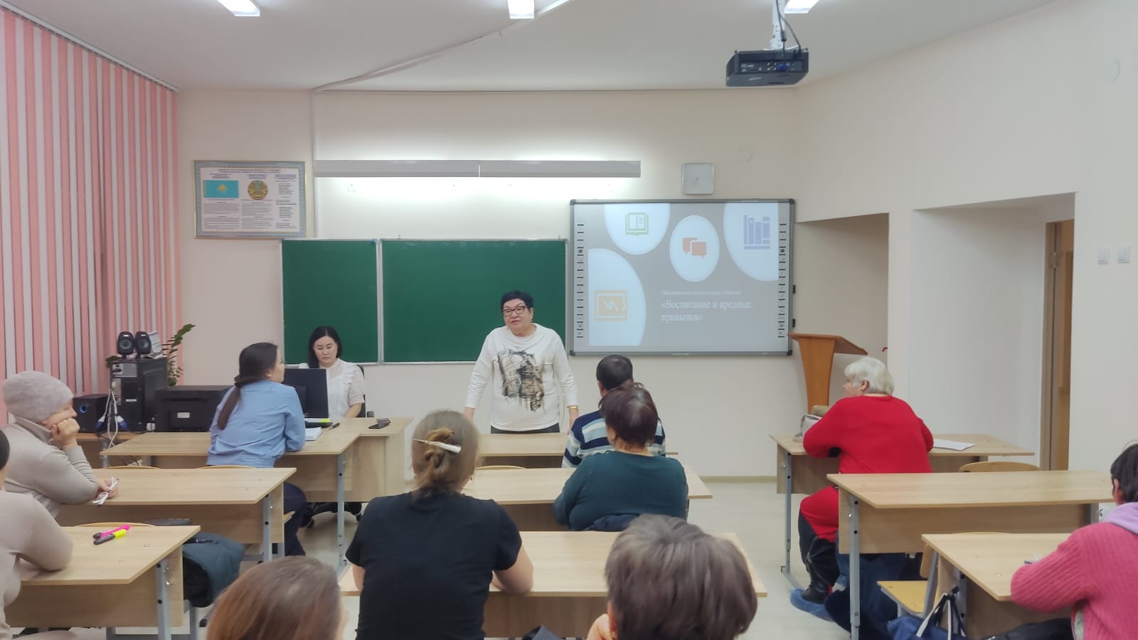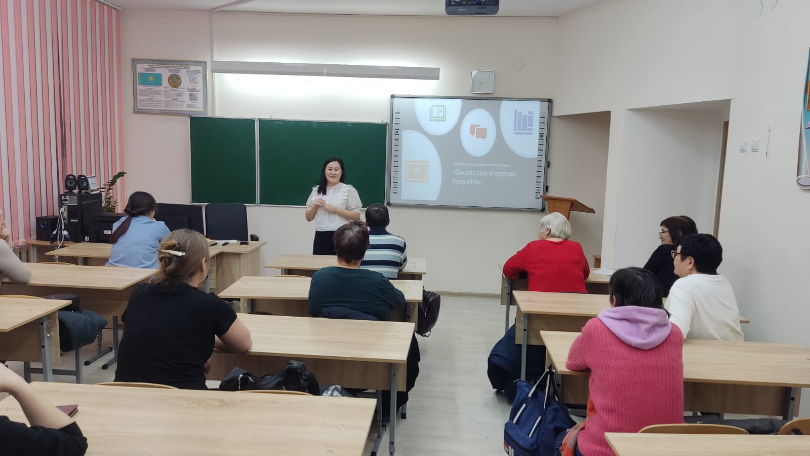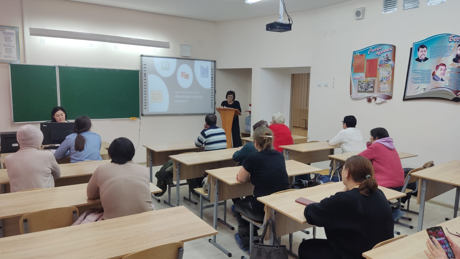 С актуальными проблемами современного общества: курением, употреблением алкогольных напитков, ПАВ, использованием бранных слов среди подростков, об искоренении вредных привычек, исходящих от семьи, ознакомила социальный педагог школы Мурзагалиева А. А. Инспектор ГЮП Шарипова Ж. М. рассказала о последствиях употребления алкоголя, ПАВ, ненормативной лексики, а также об административной, уголовной ответственности несовершеннолетних и их законных представителей за употребление и продажу наркотических средств.